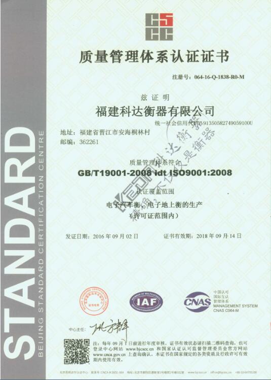 科達地磅通過ISO9001:2008質(zhì)量認證體系